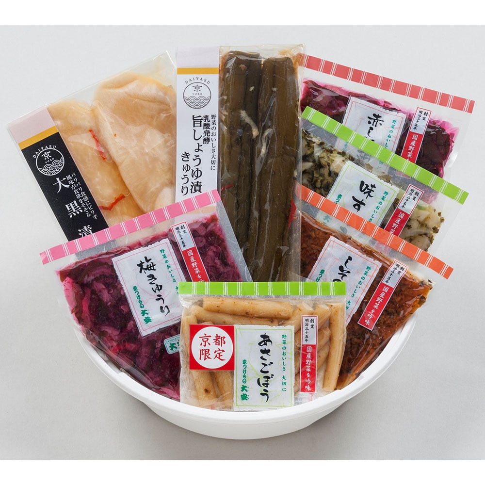 京都限定品のあさごぼう、生姜と鷹の爪がピリッときいた大黒漬、乳酸発酵の酸味にご飯がすすむ味すぐき…